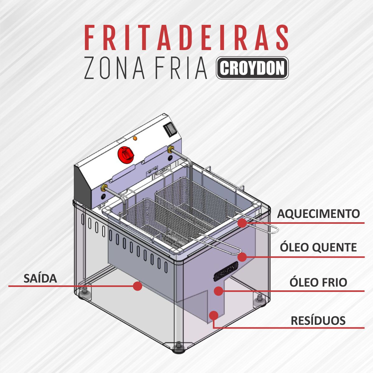 A potência da fritadeira Zona Fria é a mesma da Água e óleo, assim como as características de durabilidade do óleo e a não transferência de sabor entre uma fritura e outra.
